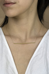 A statement necklace for daily wear, gorgeous with a t-shirt or a bold addition to your little black dress. The round tube moves on the chain, constantly changing its position and creating a new eye-catching look. Wear alone or stack with your favourites. The necklace is fitted with a stylish bayonet clasp that matches the pendant, adding an additional playful feature to the design. The necklace is worn at the height of collar bones and comes in the lengths of 42 and 46 cm.